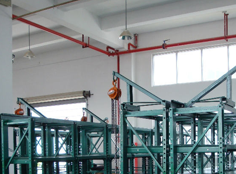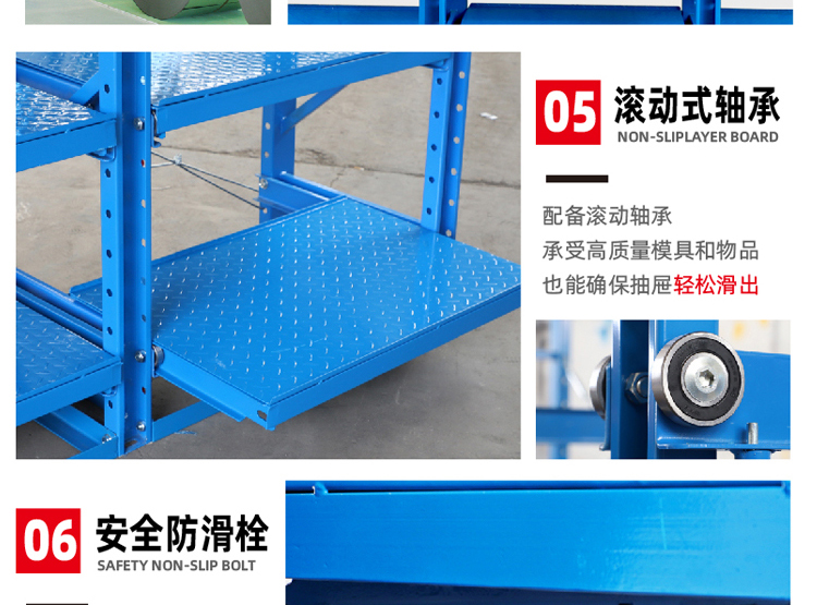 Drawer type shelves are usually used to store heavy objects such as molds, without the need for forklifts. The top can be equipped with a mobile hoist truck (hand pulled or electric) to achieve mold lifting. The bottom of the drawer board is equipped with roller tracks, which can still be freely pulled after being carried by the drawer board, and an additional positioning safety device is added. The roller track is integrally formed with molds, with extremely high precision and assembly accuracy, so the service life of the roller is greatly extended and it is easy to pull out or push in during use. The shelf height is generally below 2.5m, and can be designed and made into a drawer type structure except for the top layer. It can easily extract heavy objects up to 1000kg per layer, supplemented by cranes or hoists, to easily achieve the storage and retrieval of goods.