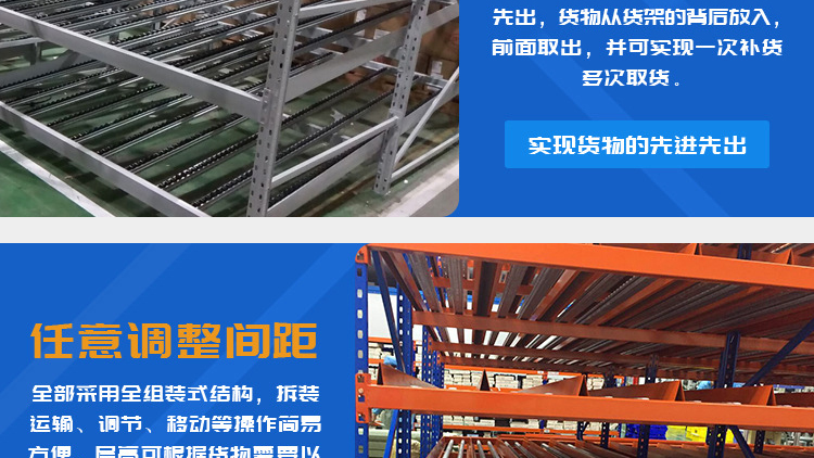 The fluency bar of the fluent shelf is directly connected to the front and rear crossbeams and the middle support beam, and the crossbeam is directly hung on the pillar. The installation inclination of the fluency bar depends on the size, weight, and depth of the cargo box, usually ranging from 5% to 9%. The carrying capacity of the fluent roller is 6kg/piece. When the goods are heavy, 3-4 fluent rollers can be installed on one roller track. Usually, a support beam is installed every 0.6m in the depth direction to increase the stiffness of the flow bar. When the raceway is long, a partition board can be used to separate the raceway. The pickup end needs to install brake pads to slow down the cargo and reduce impact.